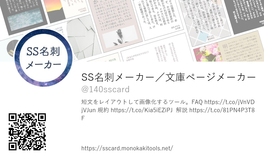L版SSメーカー SS名刺メーカーのデザインを別サイズにアレンジしたもの。L版:写真用紙(L版)の縦横比率。SSカード:Twitterサムネイルで全面表示できる縦9:横16。うたの短冊:改行せず文字サイズを合わせる機能つき。SSしおり:縦長のしおりサイズ。利用規約