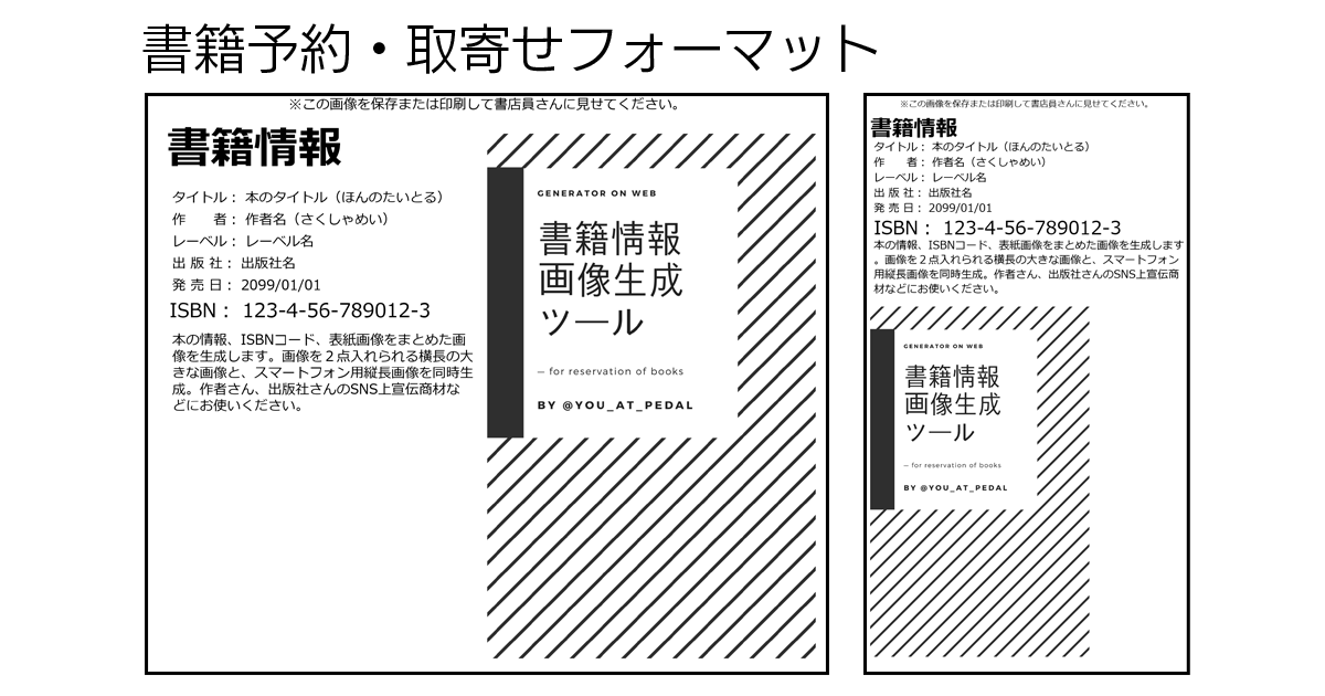 書籍を書店で予約・取り寄せする際に便利な情報をまとめた画像を生成します。PC用・スマホ用同時生成。作家さん・出版社さん・布教したいファンの人向け。